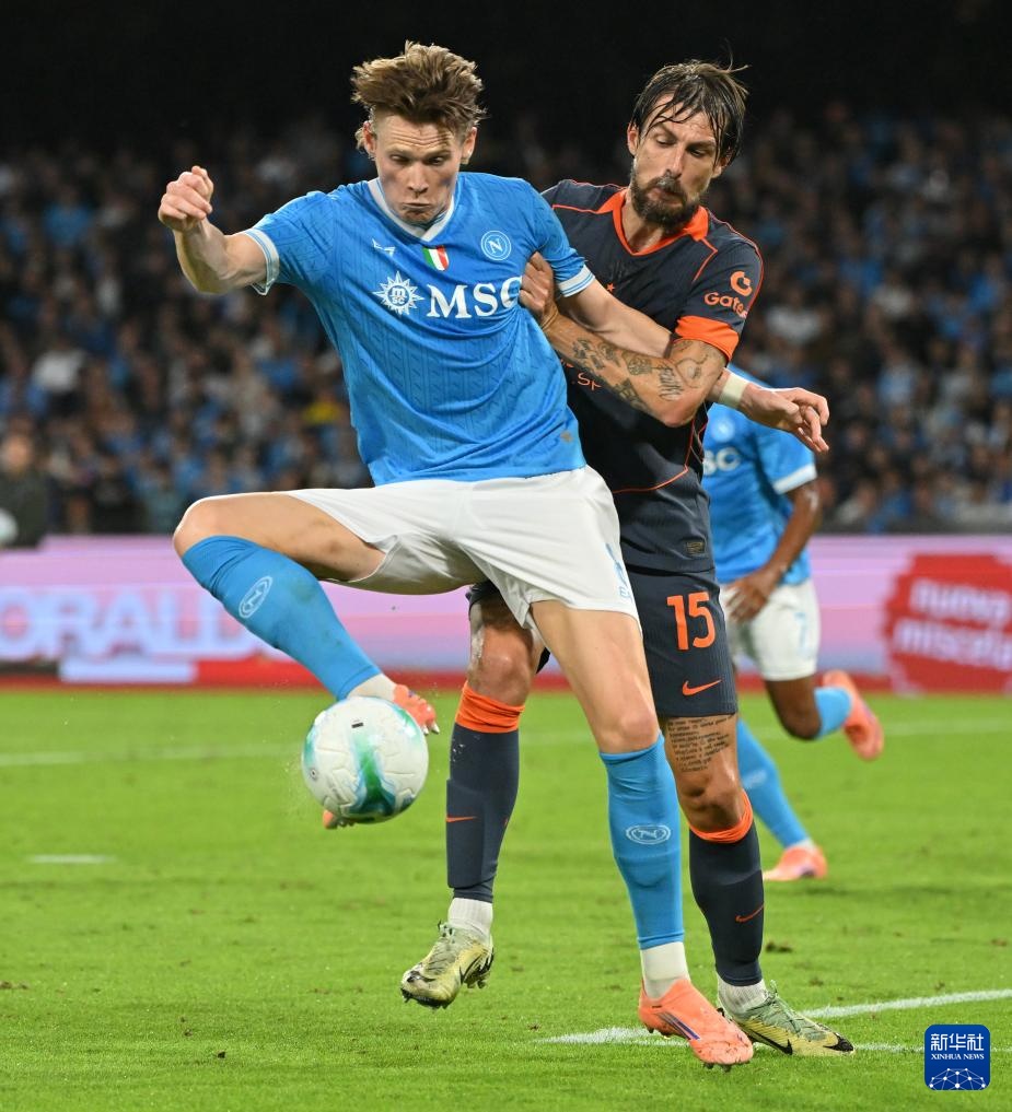 10月25日,那不勒斯队球员奥利韦拉(左)在比赛中防守国际米兰队球员邓弗里斯(中)。