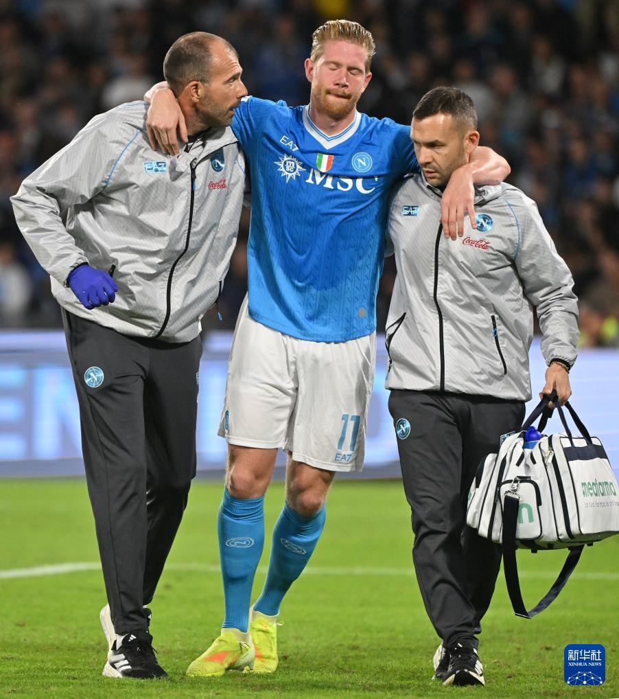 10月25日,那不勒斯队球员德布劳内(中)在射入点球后受伤离场。