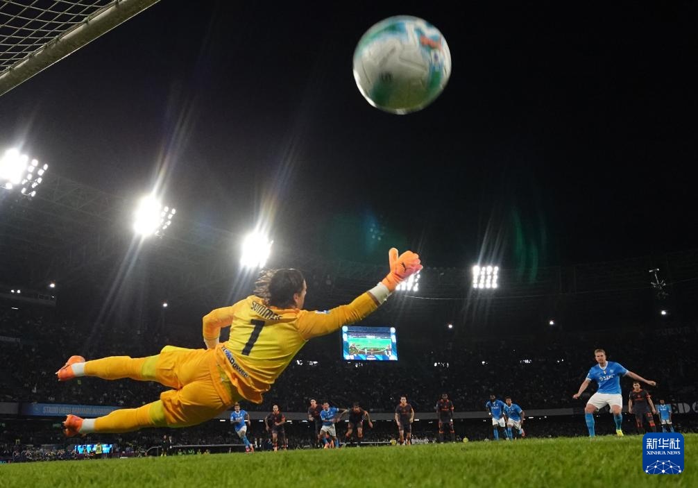 10月25日,那不勒斯队球员德布劳内(右三)在比赛中射入点球。