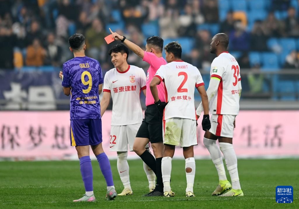 10月25日,长春亚泰队球员王禹(左二)在比赛中被主裁判出示红牌。