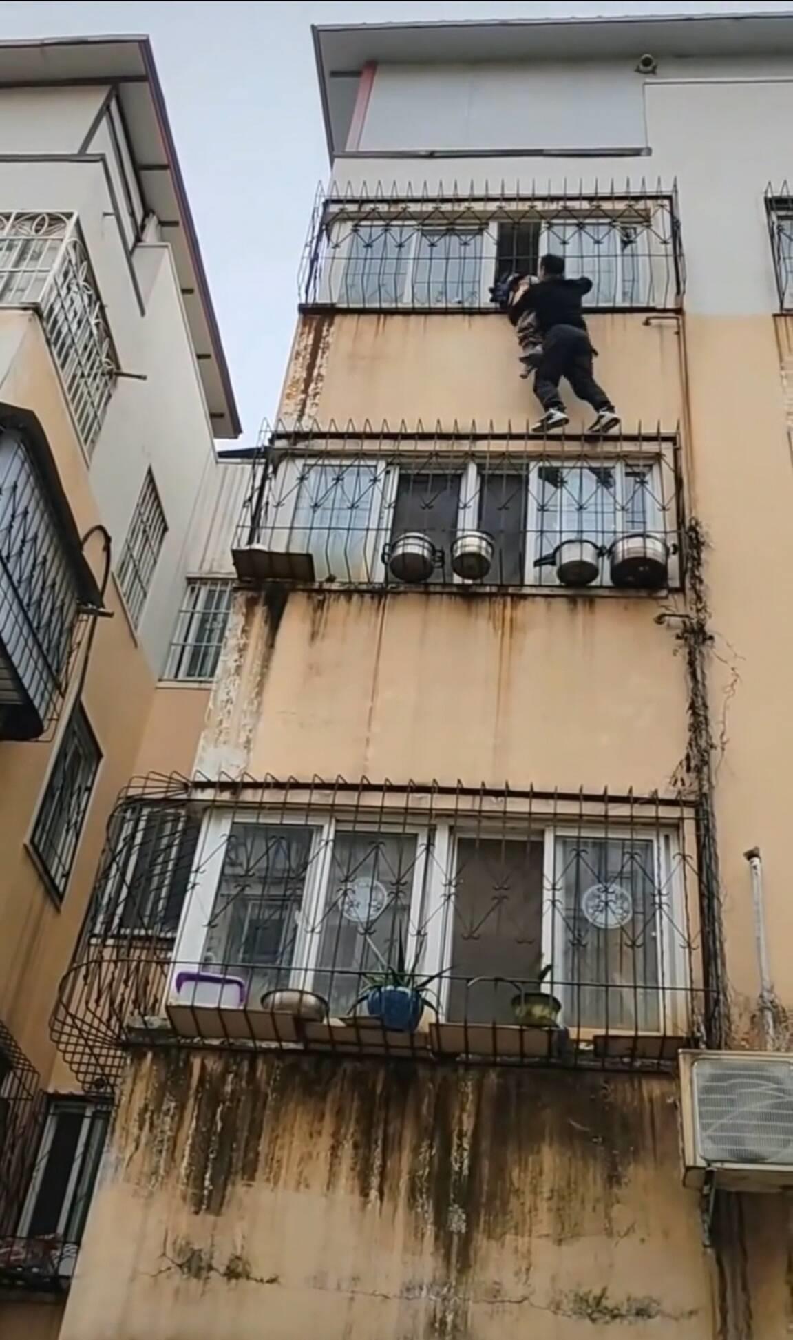 据多名网友拍摄的视频显示,一名小男孩悬吊在四楼的防盗网上,窗内有人在拉,男孩的上衣都被拉到了顶部,整个上身都赤裸着,情形十分危急。一名黑衣男子通过外墙上的防盗网,从一楼艰难地爬到了三楼,然后托举男童,将其送回窗内。目击者宋女士介绍,救人者是一名外卖小哥,他救完孩子下来时,整个人都是瘫软的,身体都在颤抖,真是个“平民英雄”!