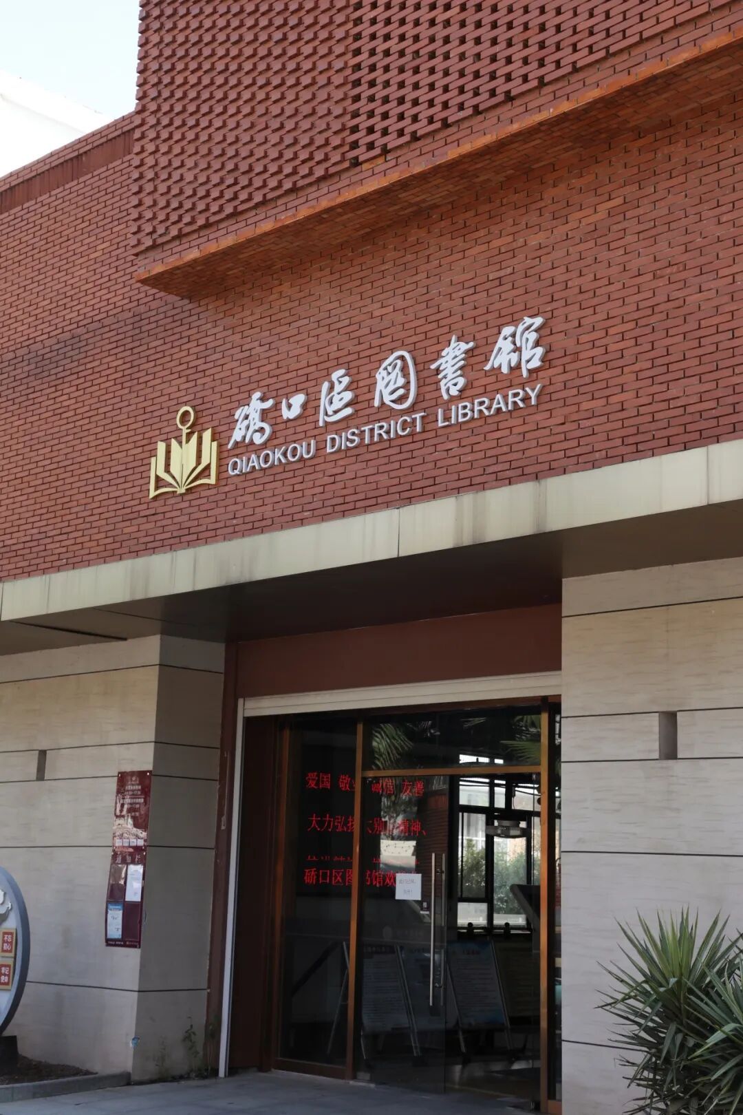 从古田坊标志一路前行,便到了硚口区图书馆。坐落在红砖房、老厂房里,高大的门头经过重新设计,巧妙融合了老厂房的旧时风貌。