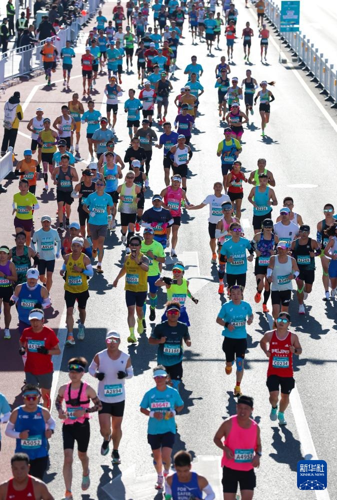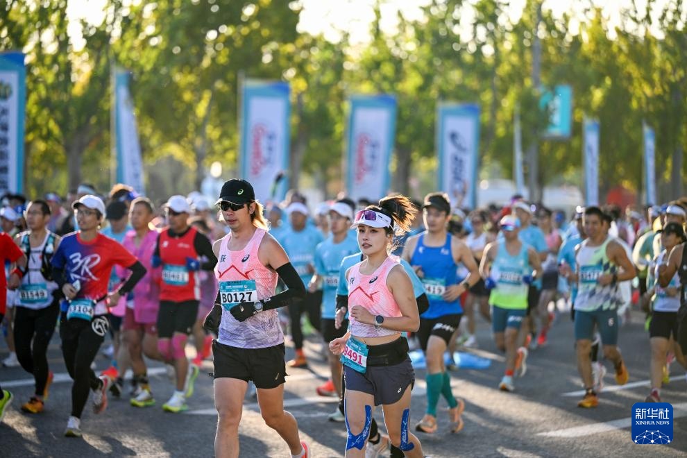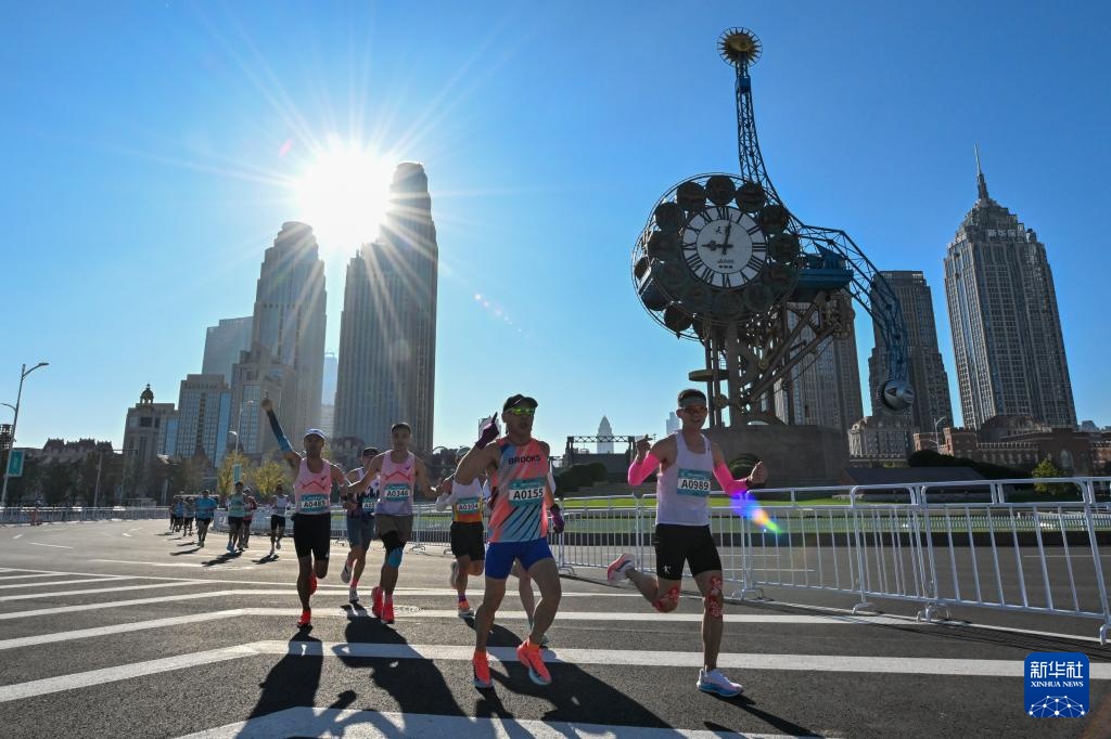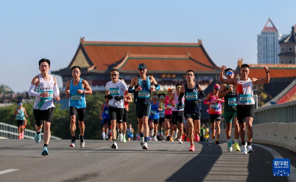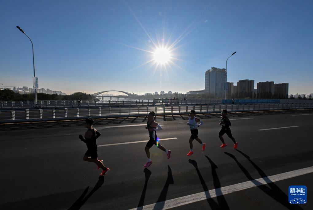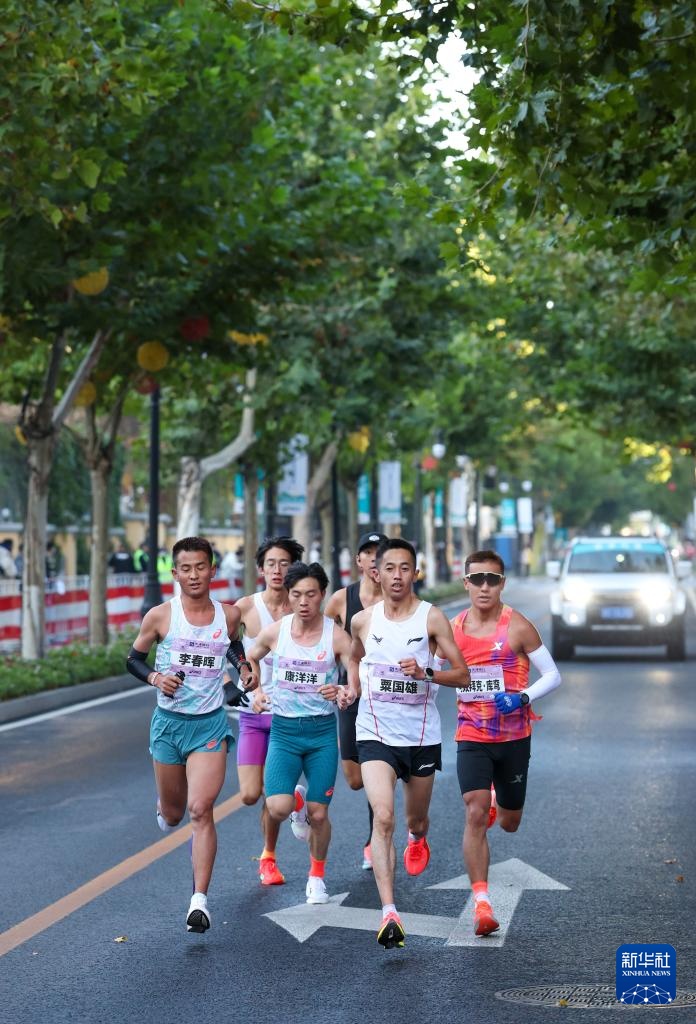 10月26日,参赛选手康洋洋(左三)在比赛中。最终,他以2小时17分06秒的成绩获得男子组冠军。