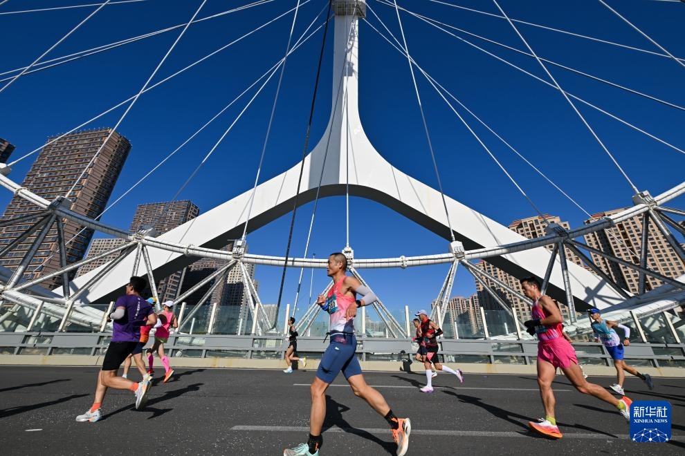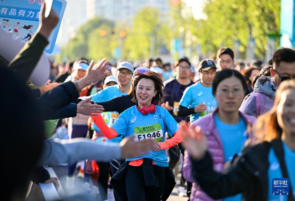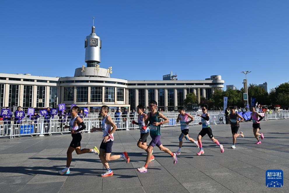 10月26日,参赛选手在比赛中跑过天津站前广场。