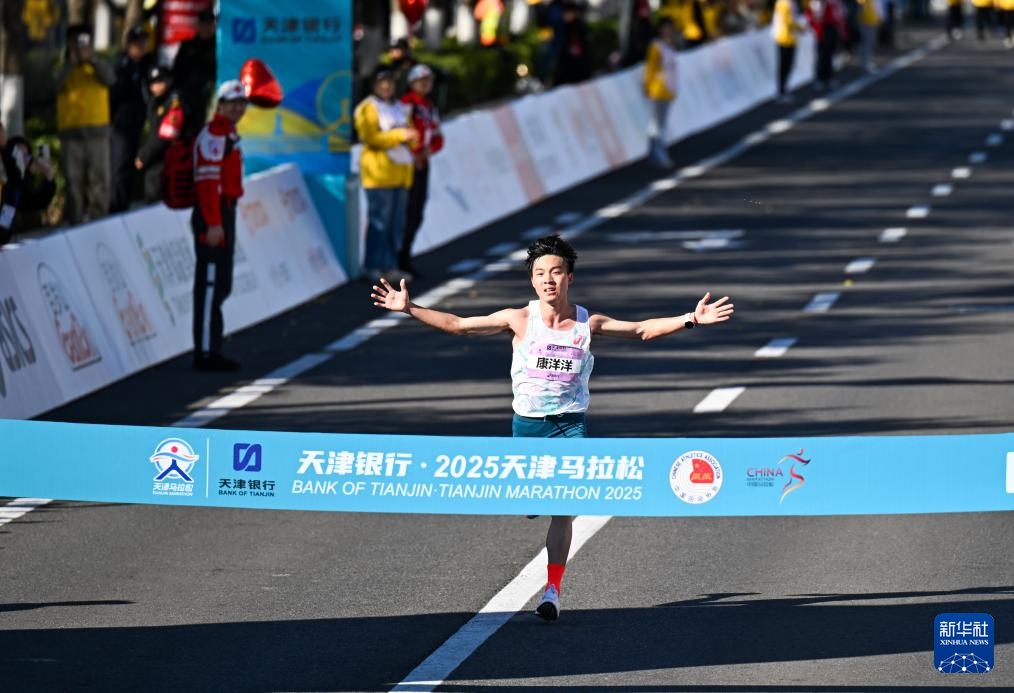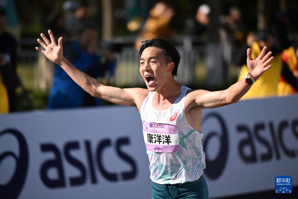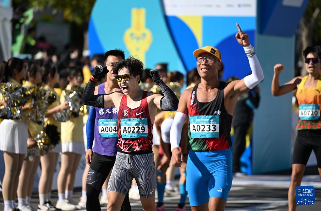 10月26日,参赛选手康洋洋冲过终点线后庆祝。最终,他以2小时17分06秒的成绩获得男子组冠军。