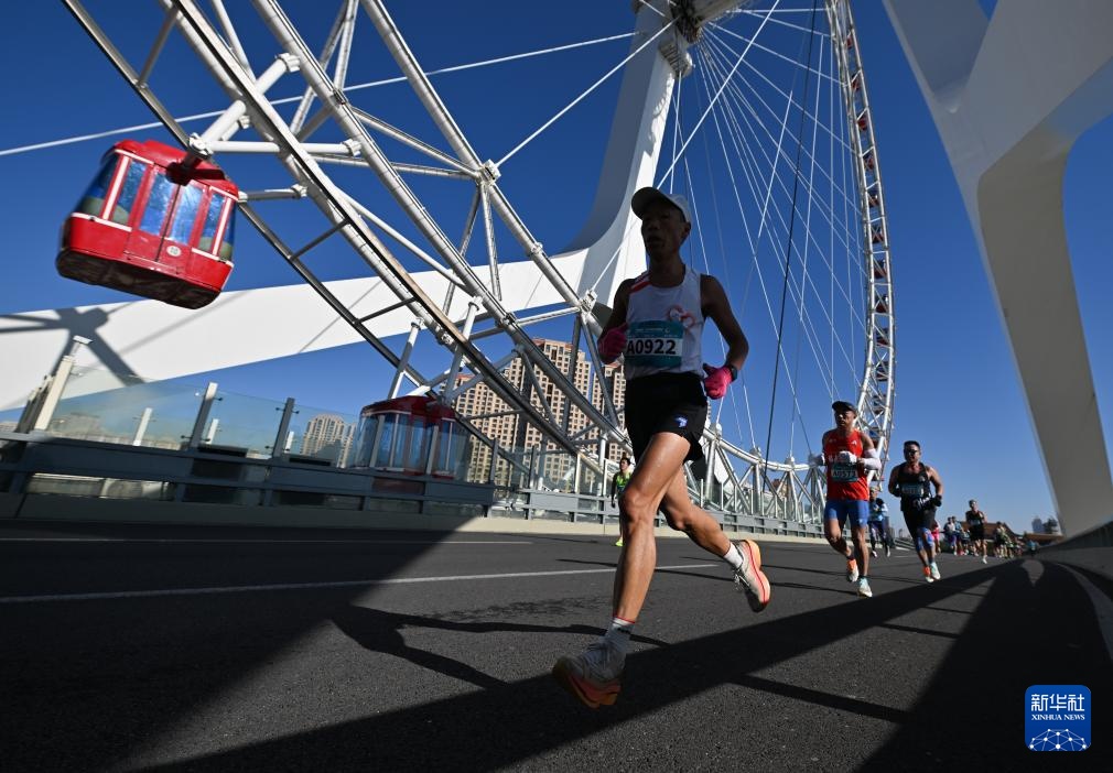 10月26日,参赛选手在比赛中跑过“天津之眼”摩天轮。