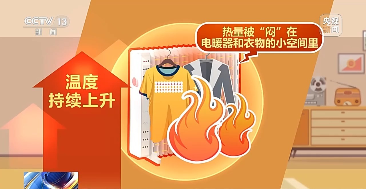 很多人喜欢把衣物放在电暖气上烤,这是有风险的!因为这样会导致热量被“闷”在电暖器和衣物的小空间里,形成一个“小烤箱”温度持续上升,可能引燃衣物导致火灾。