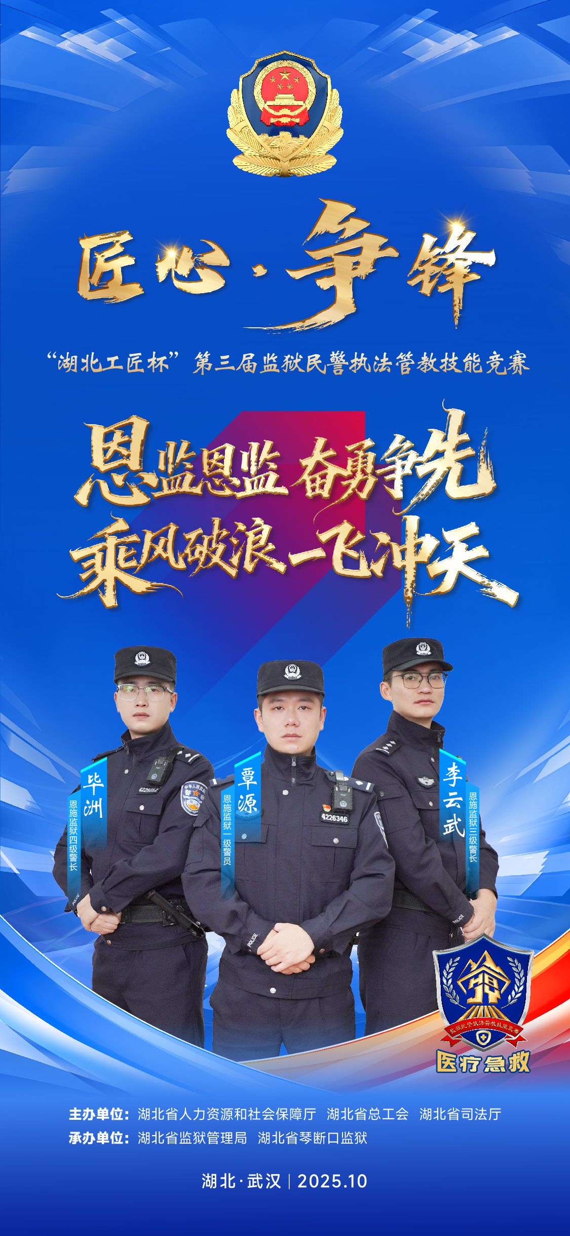 巍巍武陵扬正气,巴山润雨启新程。作为湖北唯一一所位于少数民族地区的监狱,恩施监狱针对罪犯年龄结构与健康状况特点,在赛前训练中重点强化“快速评估、精准施救”能力,参赛队员毕洲、李云武、覃源熟练掌握心肺复苏、生命体征监测等核心技能。他们的口号是“恩监恩监,奋勇争先,乘风破浪,一飞冲天”。