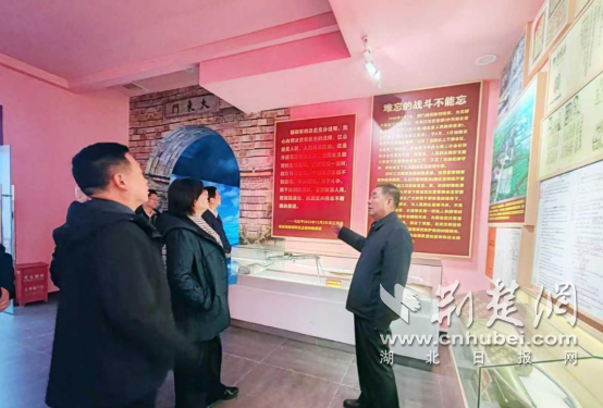钟祥市老促会副会长、钟祥市大洪山革命历史纪念馆馆长何平(右一)向王玲(左二)一行讲述钟祥革命历史。 通讯员 供图