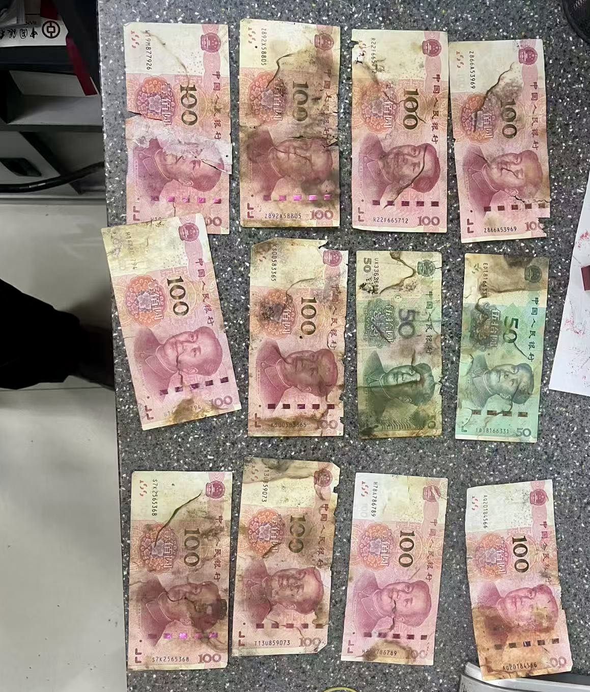 当塑料袋打开,一股浓重的金属锈蚀气味扑面而来。里面并非普通的现金,而是几沓被红褐色铁锈严实包裹的百元纸币。由于被长期存放在铁盒中,铁盒受潮腐蚀,渗出的锈水已将纸币紧紧粘连,边缘部分严重脆化,一触即有碎屑脱落。