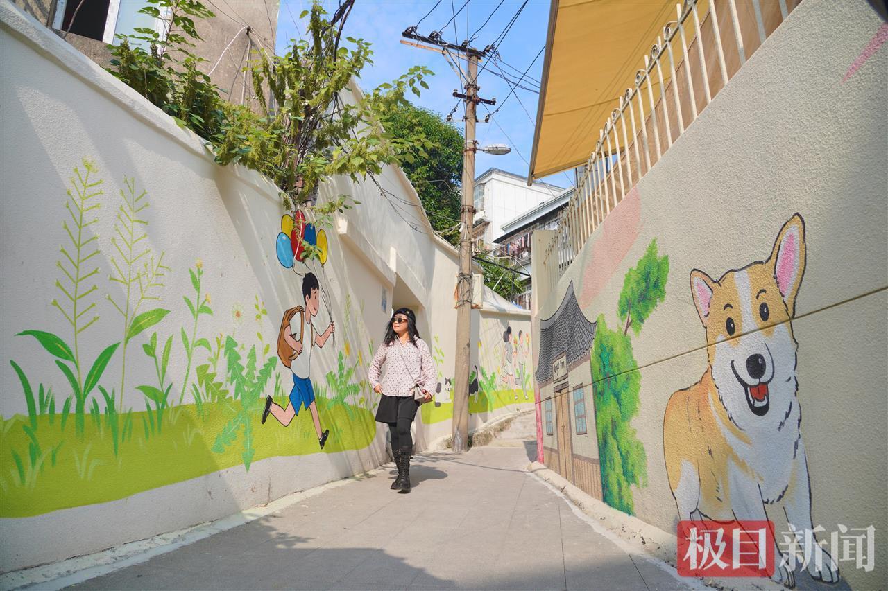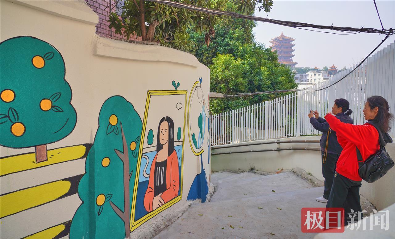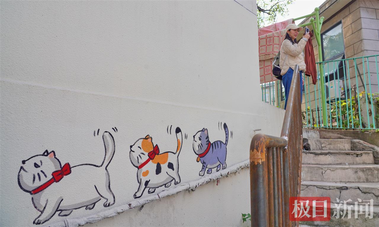 10月27日,秋日暖阳重回武汉,位于黄鹤楼脚下的三道街,近日上新了一条绵延的卡通墙画长廊,薄荷绿扶手与色彩斑斓的壁画相映成趣。这里一端连接着热门的黄鹤楼红墙,另一端直通美食云集的粮道街,成为市民秋游打卡的新地标。