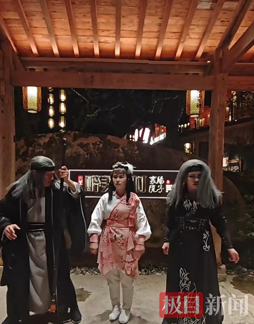 10月26日晚7时许,夜幕低垂,位于襄阳市的“农里醉美乡村·襄阳院子”餐厅灯火通明。步入餐厅,仿佛走进江南园林,亭台楼阁、流水潺潺,景致宜人。演出区域内,郭靖、黄蓉、梅超风三位金庸笔下的角色正上演精彩打戏。“快看那是谁?快来拍照!”不少食客一边用餐,一边举起手机记录,还有人实时视频连线未能到场的亲友。