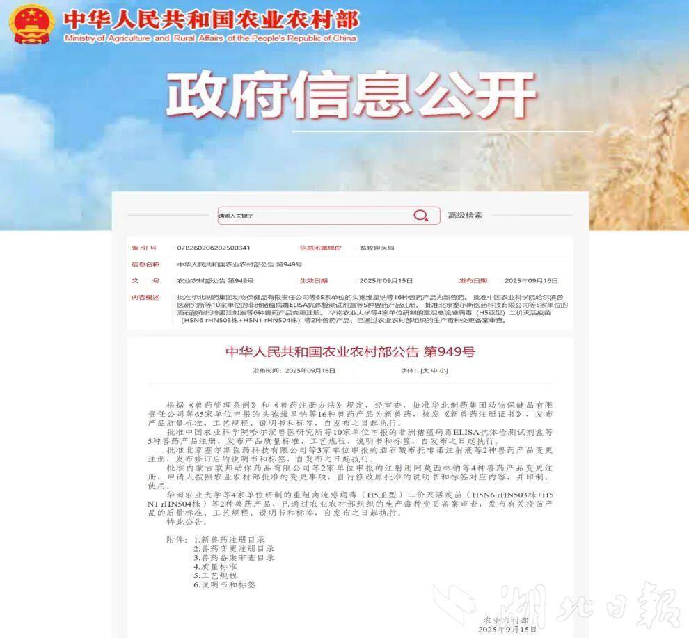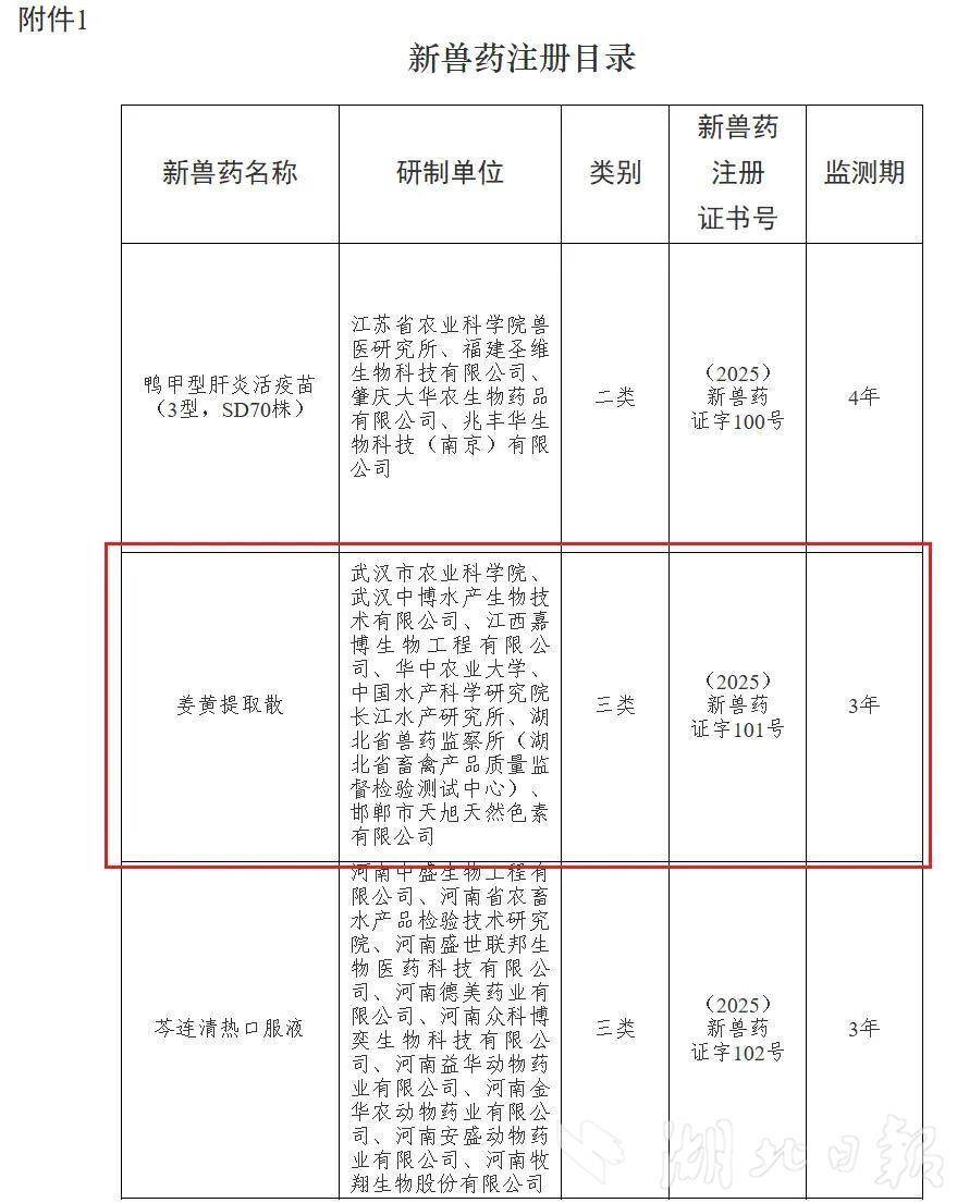湖北日报讯(记者汪彤、通讯员刘珂)10月27日从武汉市农科院获悉,由该院联合中国水产科学院长江水产研究所、武汉中博水产生物技术有限公司等单位联合研发的华中地区首款渔用中草药提取制剂——“姜黄提取散”正式获批国家三类新兽药证书,即将投入市场。这标志着我省在水产养殖动物肝损伤防控领域取得新进展,对推动水产养殖业绿色健康发展具有积极意义。