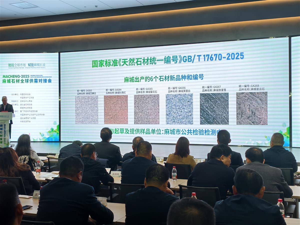 湖北日报讯(记者刘毅、通讯员陈晓辉、罗威)“麻城芝麻白、麻城芙蓉白、麻城菊花石、麻城杜鹃红、麻城星云石、麻城夜里雪,恭喜这6种麻城石材被纳入全国标准!”10月27日,随着全国石材标准化技术委员会秘书长周俊兴宣布,2025麻城石材全球供需对接会现场响起热烈掌声,这是时隔26年之后,又有6种麻城石材被纳入国标体系,标志着该市石材产业标准化建设又迈进一大步。