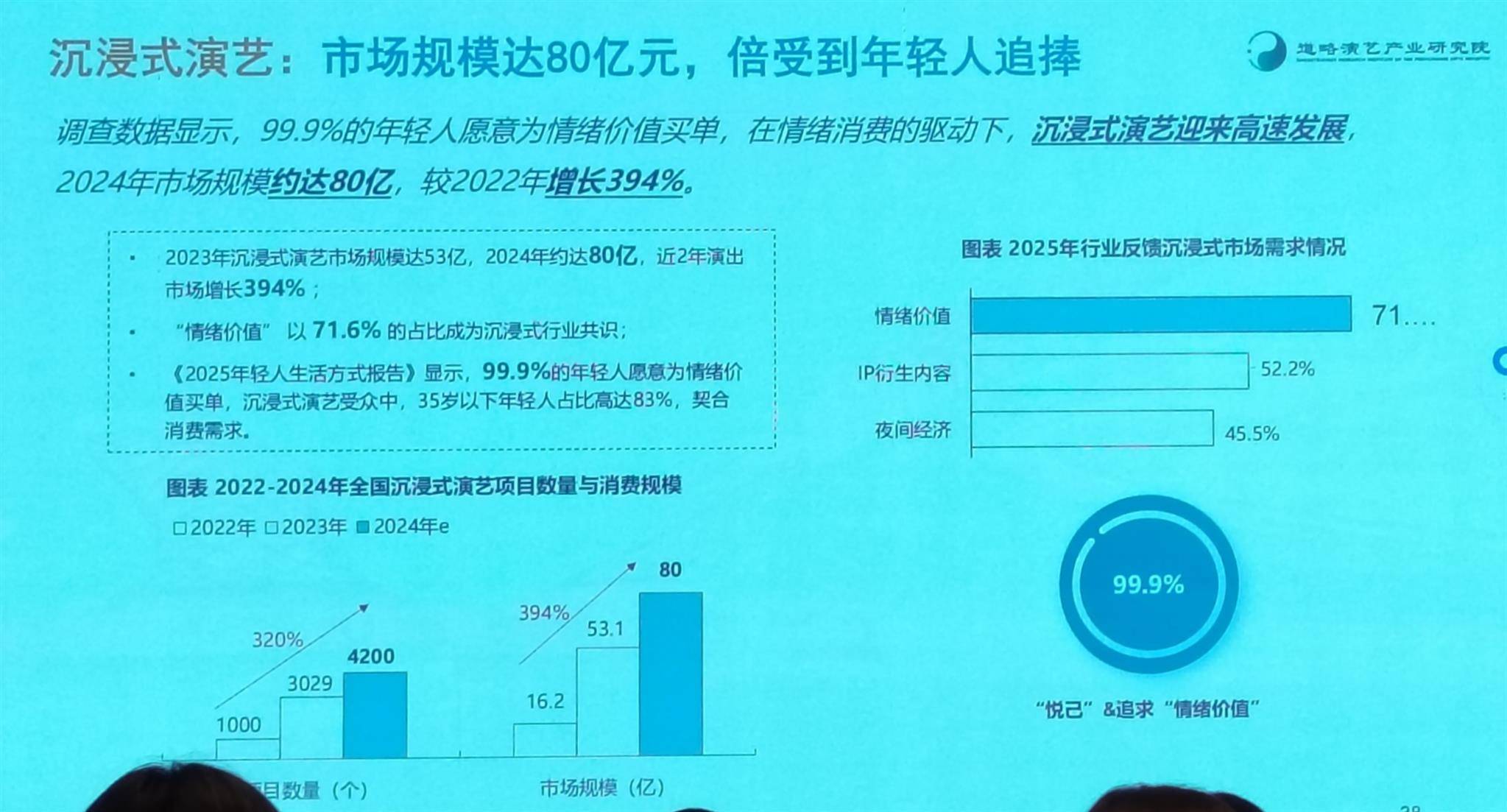 “近年来,国内的沉浸式演艺市场高速增长,从2022年的16.2亿元,到2023年的53亿元、2024年的80亿元,近两年累计增长394%。”毛修炳介绍,调查显示,沉浸式演艺受众以35岁以下年轻人为主,占比83%,他们的消费动因在于“情绪价值驱动”,99.9%的年轻人愿意为情绪价值买单,所以“情绪价值”已成为行业共识,71.6%的从业者认为情绪价值是沉浸式演艺的核心需求。他以自己在河南万岁山旅游景区的亲身感受为例,强调了这一观点。
