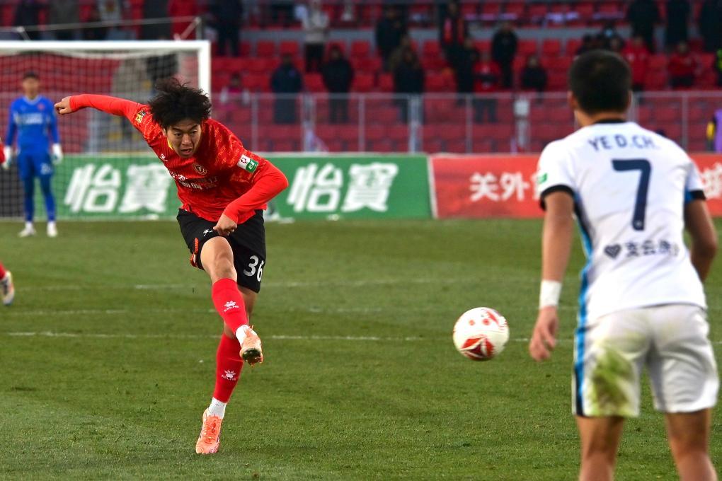 10月26日,辽宁铁人队球员田德澳(左)在比赛中射门。新华社记者 吴青昊 摄