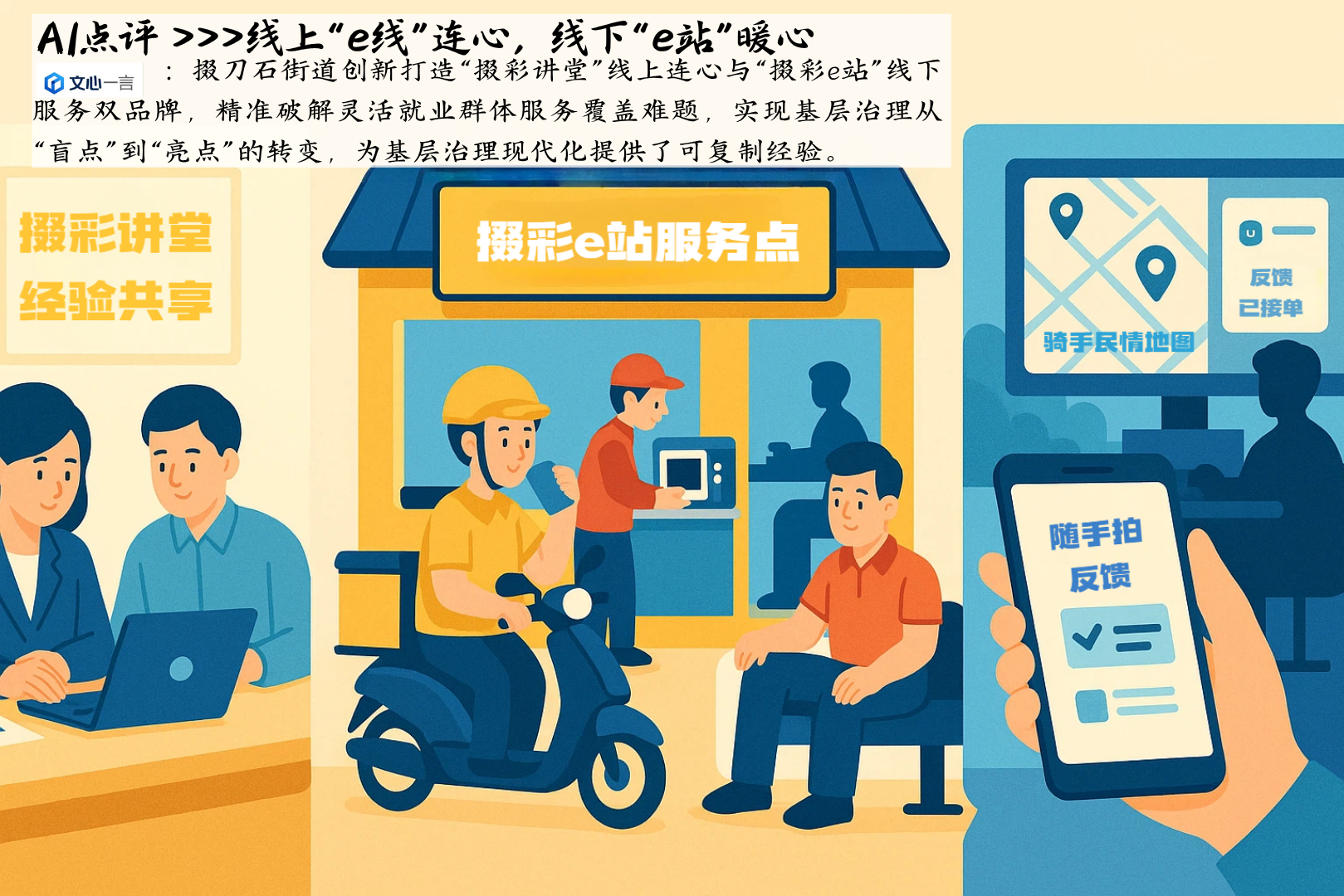 在线下,掇刀石街道科学规划布局,整合党群服务中心、商圈楼宇等资源,建设了“掇彩e站”及服务点,设立报到点,形成“15分钟服务圈”。这些站点不仅提供饮水、充电、休憩、应急药品等基础服务,更成为线下联系服务的重要节点。通过线上预约、线下体验的模式,开办“小哥课堂”“小哥议事厅”,为新就业群体提供法律咨询、健康义诊、子女托管等增值服务,将线上收集的需求转化为线下实实在在的关爱行动,实现了“需求线上汇、服务线下达”。