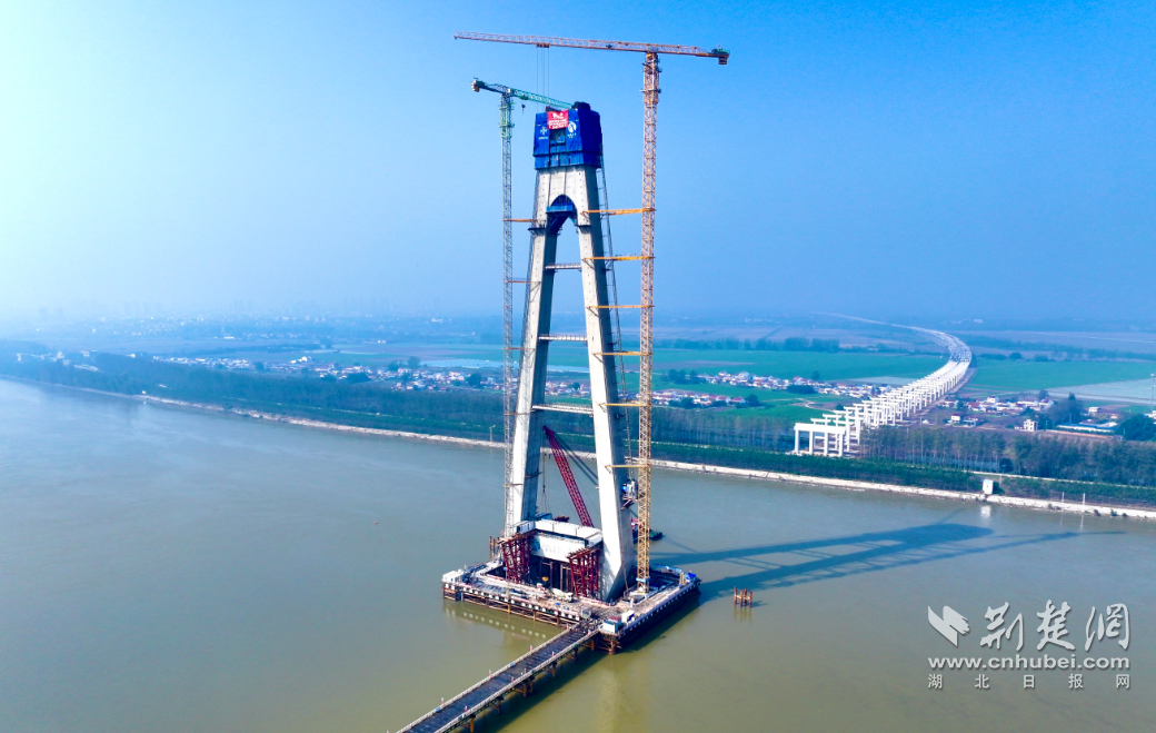 汉江特大桥由湖北交投集团投资建设、中交一公局集团承建,全长660米,为国内最大跨径无辅助墩组合梁独塔斜拉桥,主跨设计为2×330米小边箱钢-混组合梁,大桥主塔设计为钻石型结构,由塔座、下塔柱、下横梁、中塔柱、塔顶连接部和塔冠等几个部分组成,总高达187.7米,相当于一座60多层的摩天大楼。采用液压爬模施工,共分33个节段,标准节段6米/节。