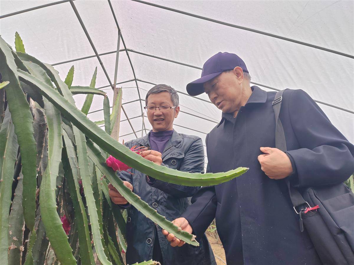 刘湘林(右)在宜都市乡韵家庭农场指导火龙果种植。(湖北日报全媒记者 张泽牧 摄)