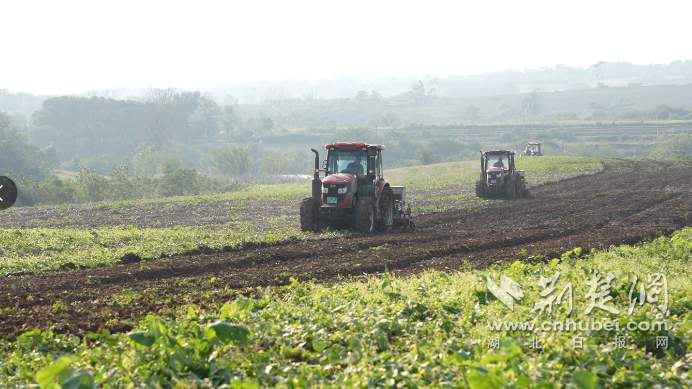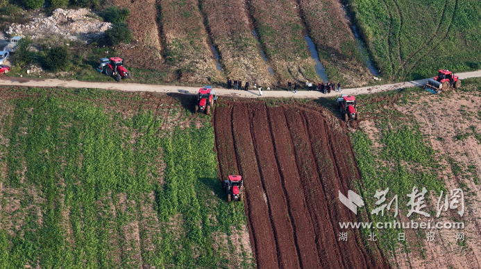 荆楚网(湖北日报网)讯(通讯员 蔡丹丹)10月28日,秋阳正暖,在荆门市掇刀区麻城镇斗立村,5台大型农机正轰隆作响,热火朝天地抢播油菜。