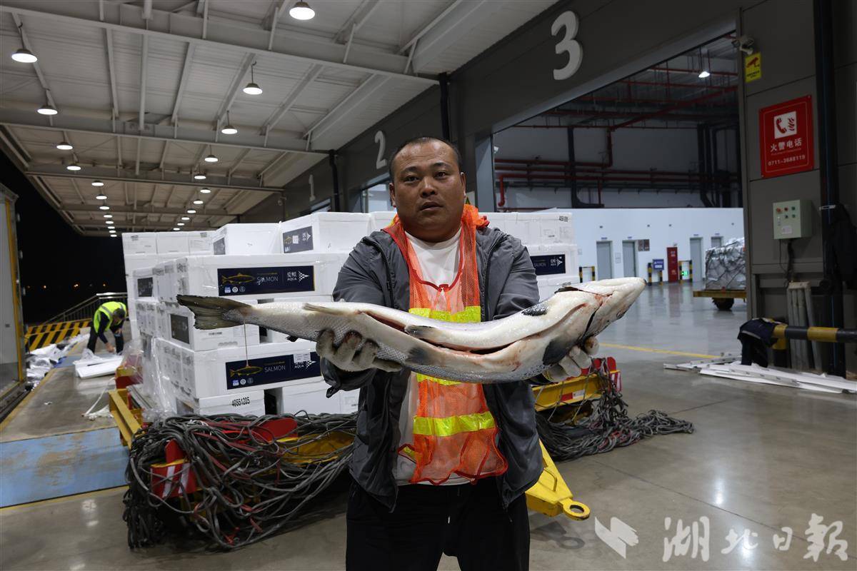 除了车厘子,同机抵达的还有20吨智利三文鱼。鄂州零壹航空服务有限公司现场主管李松随手打开一箱,里层的冰块还没融化。“三文鱼体长超过半米,每条约5至7公斤,新鲜!”李松说。