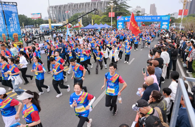 10月12日,2025天门马拉松在陆羽广场鸣枪开赛。