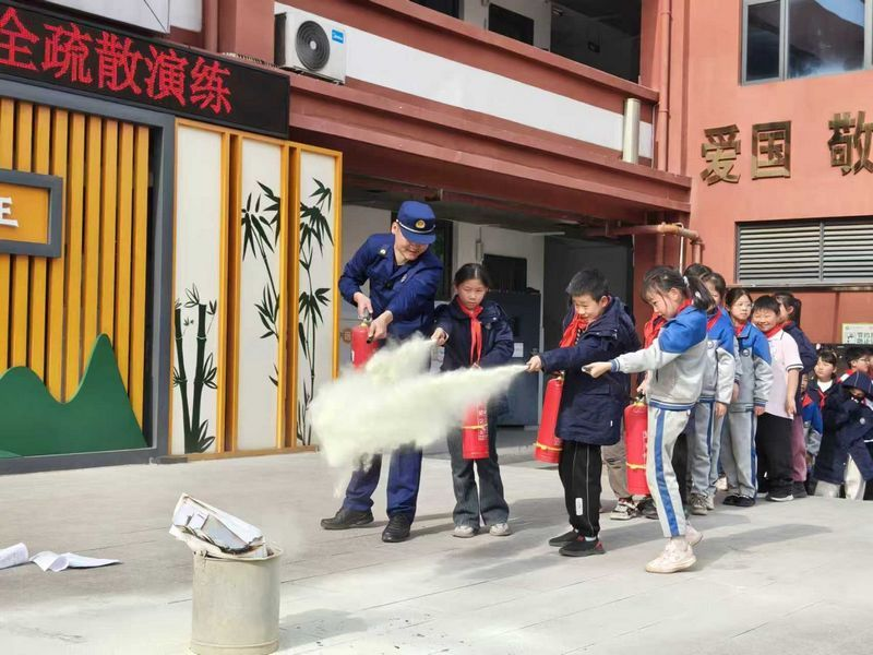 “火焰蓝”宣教队结合校园火灾典型案例,深入浅出地讲解了火灾的危害及成因,重点普及校园火灾预防要点——提醒学生不玩火、不随意触碰电气设备,牢记“人走电关”的安全准则。同时,针对小学生群体特点,用通俗语言解读了“小火快跑、浓烟关门”的逃生口诀,详细演示弯腰低姿前行等疏散逃生动作,明确强调火灾发生时切勿乘坐电梯,发生火灾时及时拨打火警电话及报警时需说清的关键信息。随后,“火焰蓝”宣教队现场演示了灭火器“提、拔、握、压”的使用步骤,并邀请学生代表亲手操作灭火,在“实战”中掌握灭火技能。