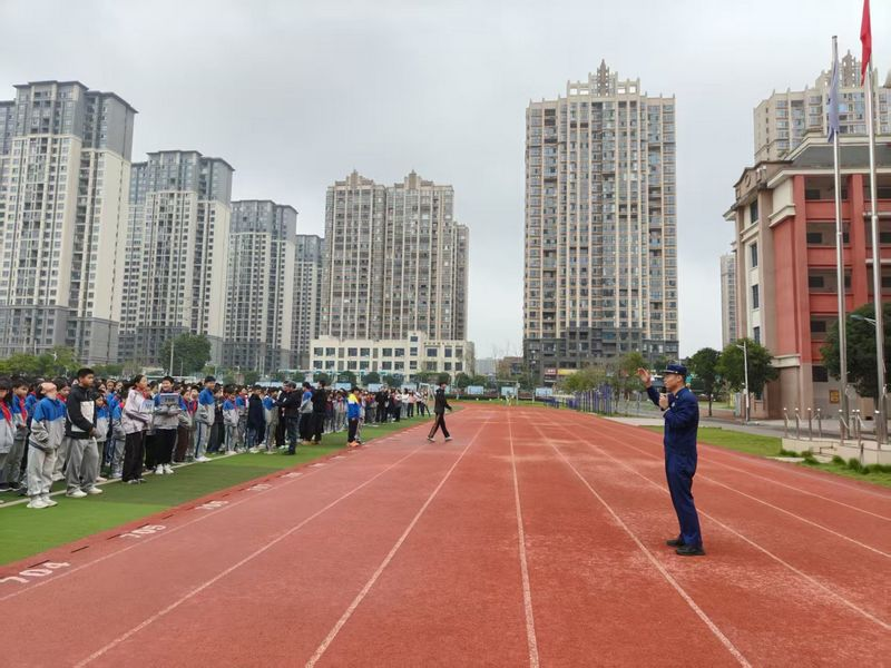 随着警报声骤然响起,演练正式拉开帷幕。学校全体师生在消防救援人员的指导下,按照疏散路线,用毛巾或袖口捂着嘴鼻,沿着墙壁,快速有序地从各教学楼疏散至操场的安全地带。整个过程组织严密、紧张有序,达到了预期效果。