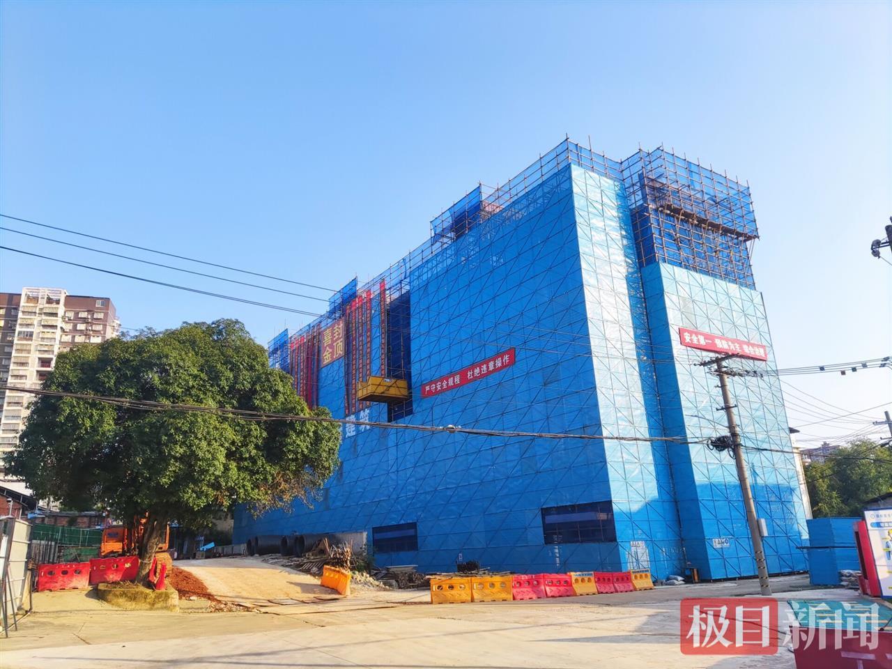 10月24日,极目新闻记者在咸安区桂花路社区交通路的兴达小区危旧房改造项目现场看到,一栋7层楼的住宅楼已经封顶,大楼外悬挂着祝贺的条幅。现场另外一栋楼也已经完成了地基施工项目。