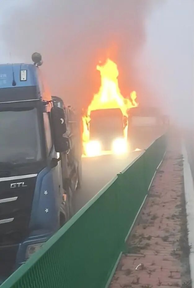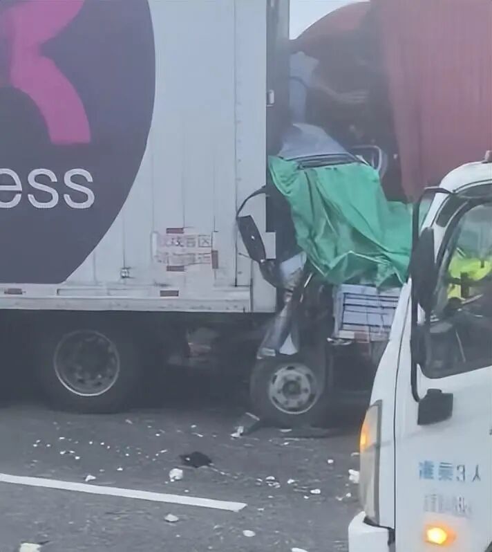 一段由现场网友拍摄的视频显示,雾气弥漫的路面上,一辆快递货车先后被银色双排小货车和红色货车追尾。银色小货车车头因挤压严重变形,几乎与后车厢贴合。后方,多辆重型卡车看似未受明显损伤,但在更远处,因雾气过浓难以辨识具体车辆数量,仅可见距离快递车约50米处有明显火焰。