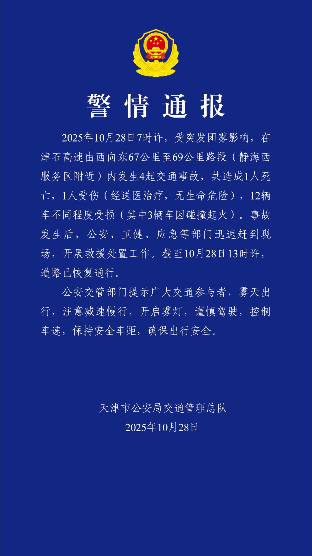 10月28日,天津市公安局交通管理总队通报:2025年10月28日7时许,受突发团雾影响,在津石高速由西向东67公里至69公里路段(静海西服务区附近)内发生4起交通事故,共造成1人死亡,1人受伤(经送医治疗,无生命危险),12辆车不同程度受损(其中3辆车因碰撞起火)。