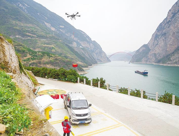 鄂西秭归县“四季有橙”。峡江两岸的果园,无人机将一筐筐脐橙吊运出山。