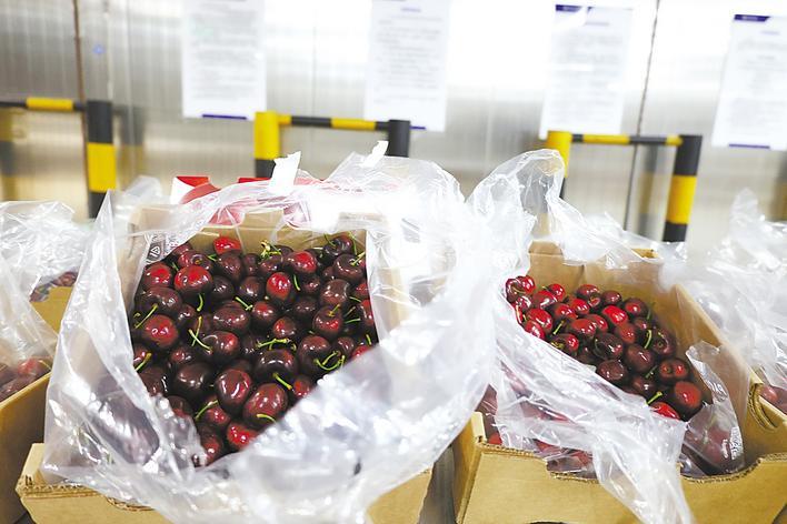 鄂州花湖国际机场迎来今冬首批智利车厘子。 (湖北日报全媒记者 周鹏 摄)