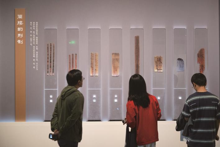 10月28日,湖北省博物馆联合全国多家文博机构推出的《简读中国——中国出土简牍展》开幕。本次展览展出了曾侯乙墓竹简、战国楚简、睡虎地秦简、里耶秦简、敦煌悬泉汉简等230件(套)重要简牍文物,其中曾侯乙墓竹简是迄今发现时代最早的竹简,距今2400多年。 新华社发