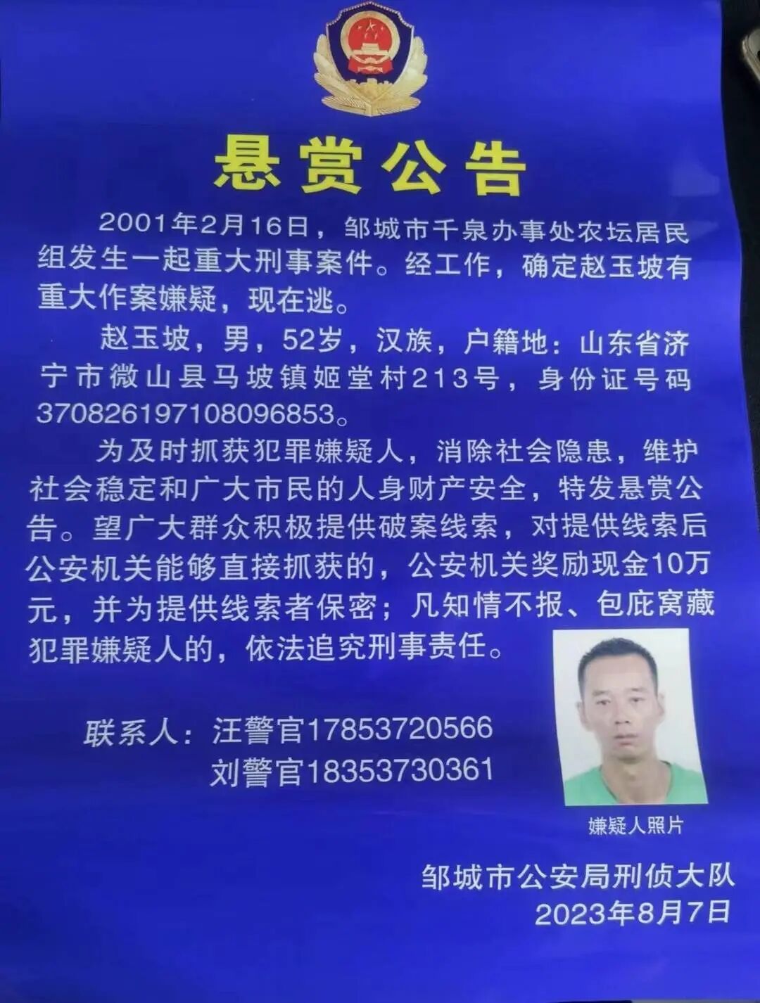 起诉书也显示,邀集他人抢婴的嫌疑人赵玉坡为“在逃”状态。李得喜表示,赵玉坡是他当年的邻居,他曾和赵玉坡见过两次,但没有来往。2023年8月,邹城警方曾对赵玉坡发布悬赏公告。