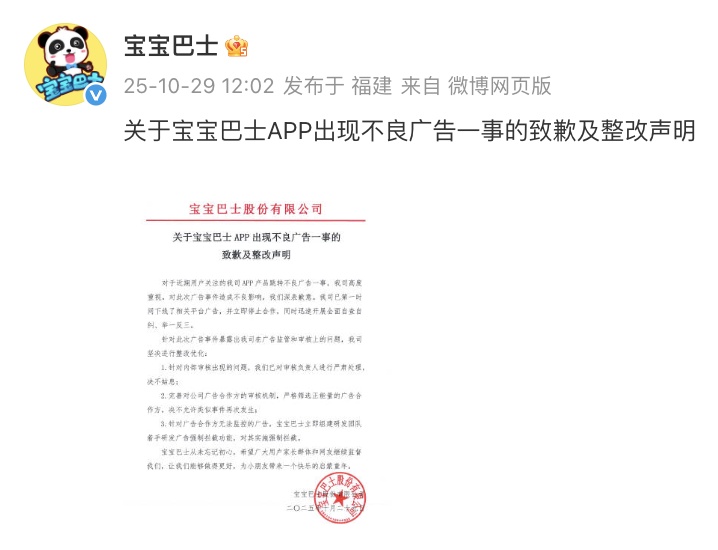宝宝巴士股份有限公司10月29日发布《关于宝宝巴士APP出现不良广告一事的致歉及整改声明》: