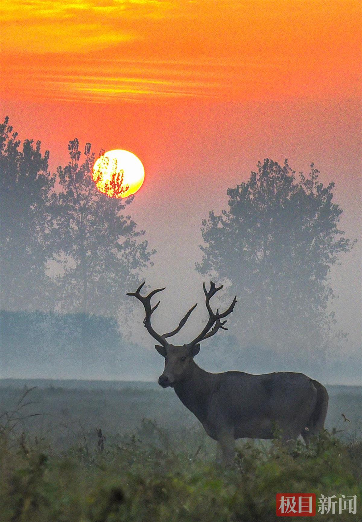 石首麋鹿国家级自然保护区,一头麋鹿在朝阳下觅食(极目新闻记者 黄志刚 摄)