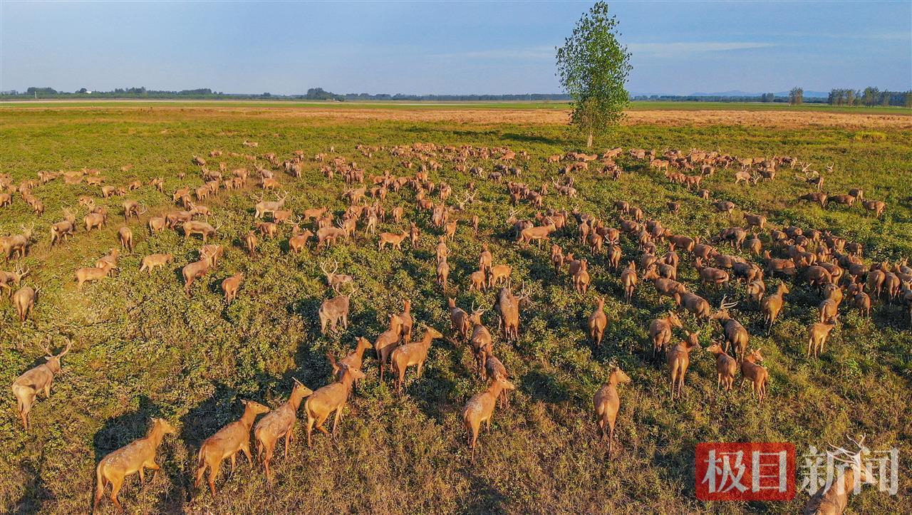 呦呦鹿鸣,食野之苹。深秋霜降,在湖北石首麋鹿国家级自然保护区,4500余头麋鹿徜徉在长江故道,它们或悠然觅食,或戏水嬉闹,好一幅和谐的生态画卷。