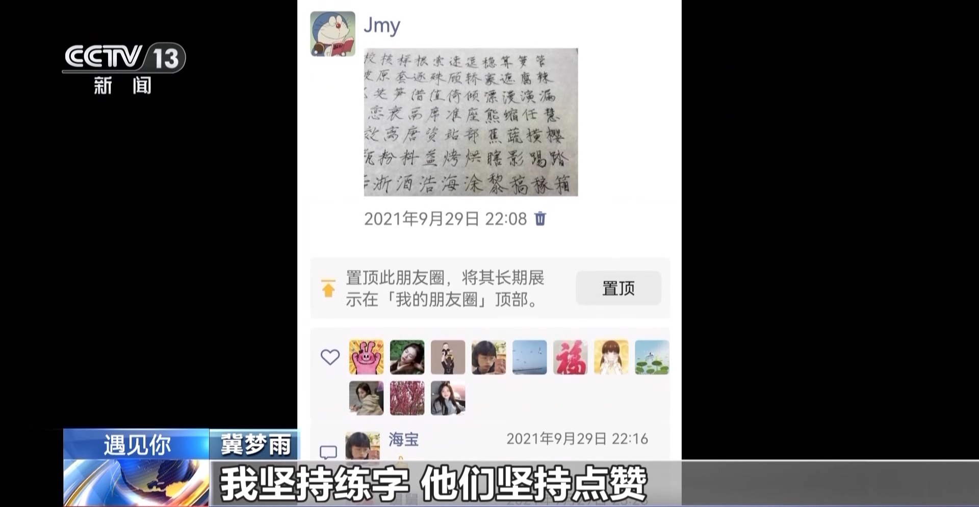 冀梦雨:初衷是因为我当时大学上的是师范专业,我们有一门专业课就是书法课,除此之外,作为一个师范专业,我们的教师技能就是要求你必须写好硬笔字,软笔字包括黑板字。我刚开始练字的时候,我的妈妈和舅舅每天都会坚持在我朋友圈点赞,我坚持练字,他们坚持点赞还会给我评论,一直给我评论一个大拇指。养成习惯之后就不知不觉自己就一直这样练下来了。