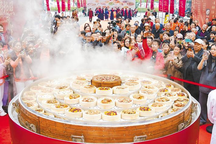 湖北日报讯 (记者杨文漪)10月29日,重阳节上午,武汉市江夏燕尔阁艺术宴会中心蒸汽弥漫、竹香四溢。一场别开生面的“敬老楚宴·蒸爱江夏”非遗蒸菜银发经济消费盛典在此举行,直径达4米的湖北原产巨型蒸笼揭开瞬间,将活动现场气氛推向高潮。