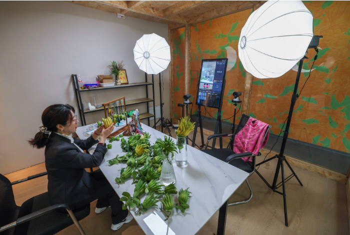在浙江金华市金东区赤松镇北山口村的金华佛手农林服务中心内的直播间,工作人员进行佛手鲜果及衍生产品的直播销售(2025年10月22日摄)。新华社记者 徐昱 摄