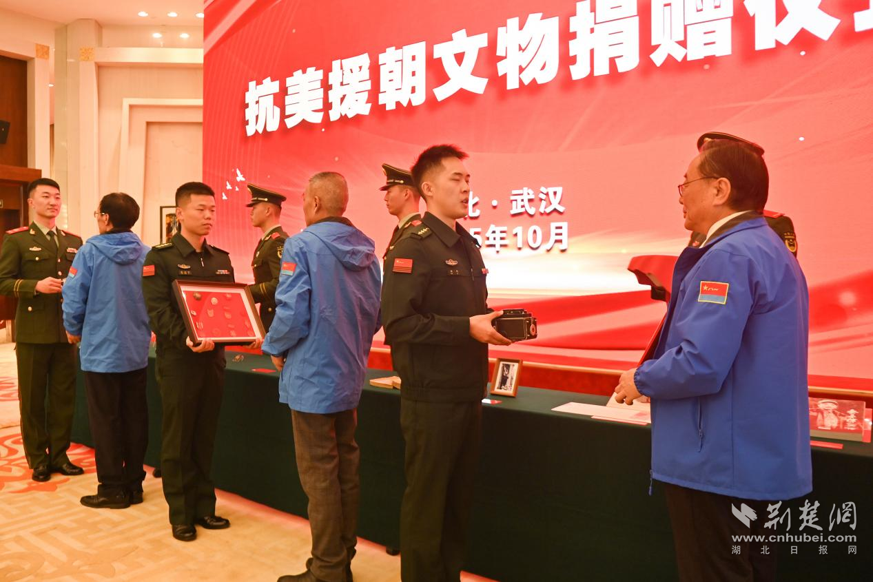 荆楚网(湖北日报网)讯(记者成超 通讯员田健 薛葵)今年,是中国人民志愿军抗美援朝出国作战75周年。10月29日上午9时,一场抗美援朝文物捐赠仪式在武警湖北总队武汉支队执勤九中队举行。3名抗美援朝老兵后代将勋章、相机、书籍等24件珍贵文物郑重交到中队第28任指导员杨征宇手中。