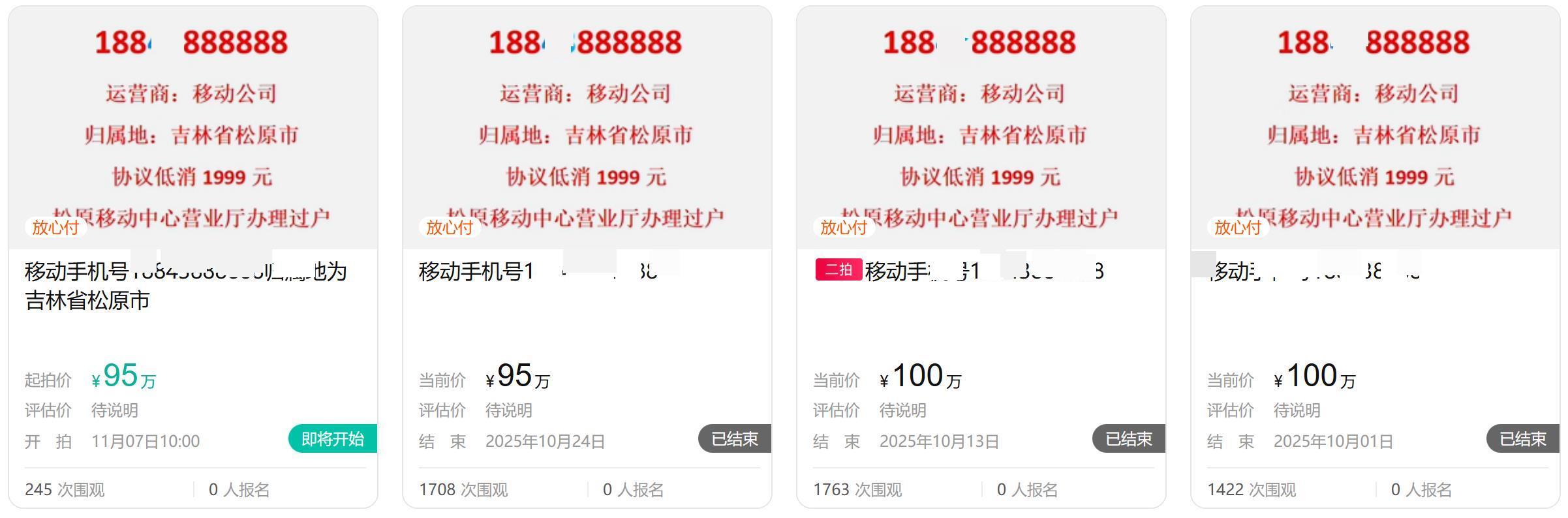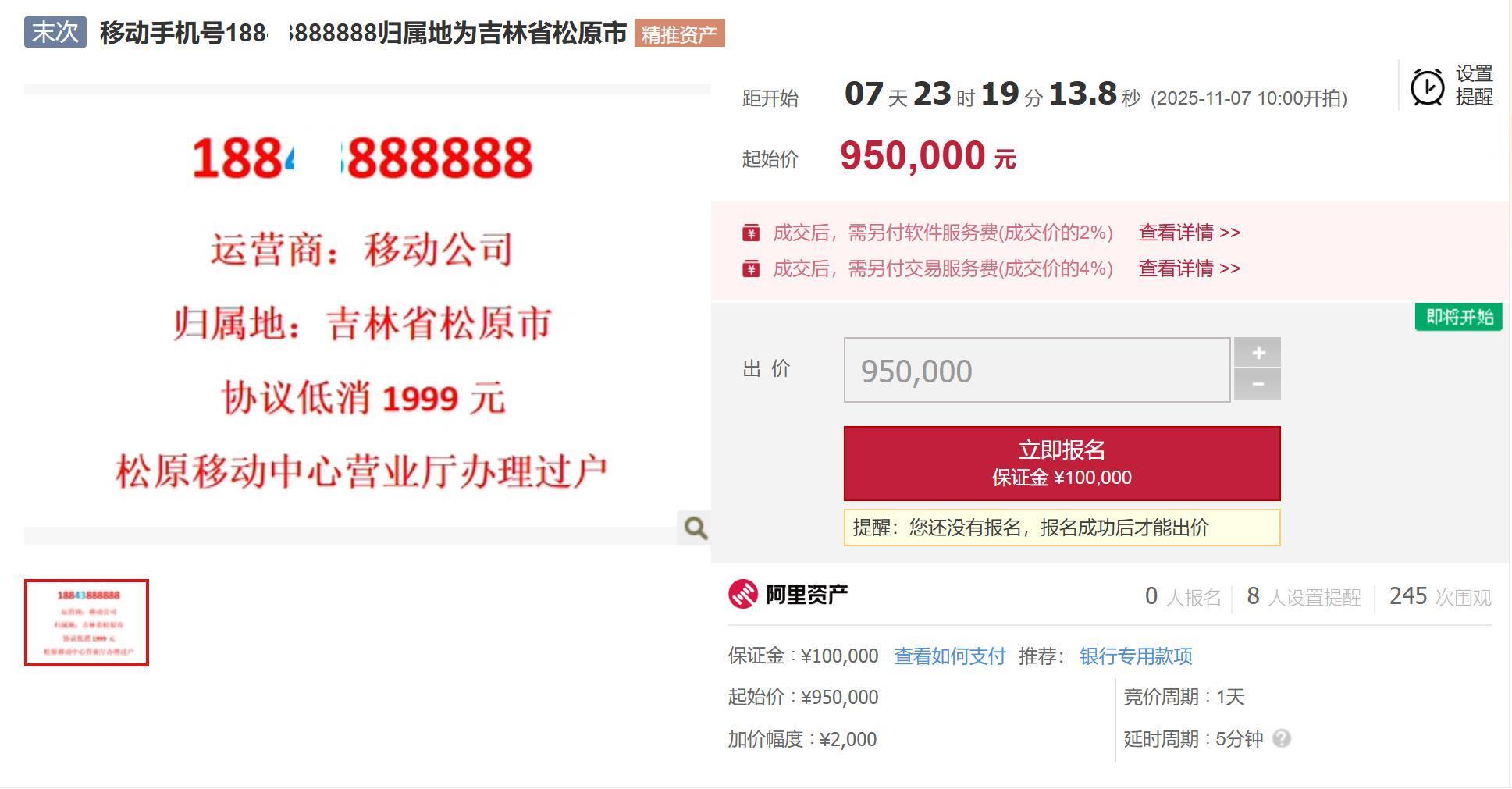 10月30日,极目新闻记者从阿里司法拍卖平台获悉,归属地为吉林松原市移动手机号188**888888,将于11月7日进行拍卖,起拍价格为95万元。