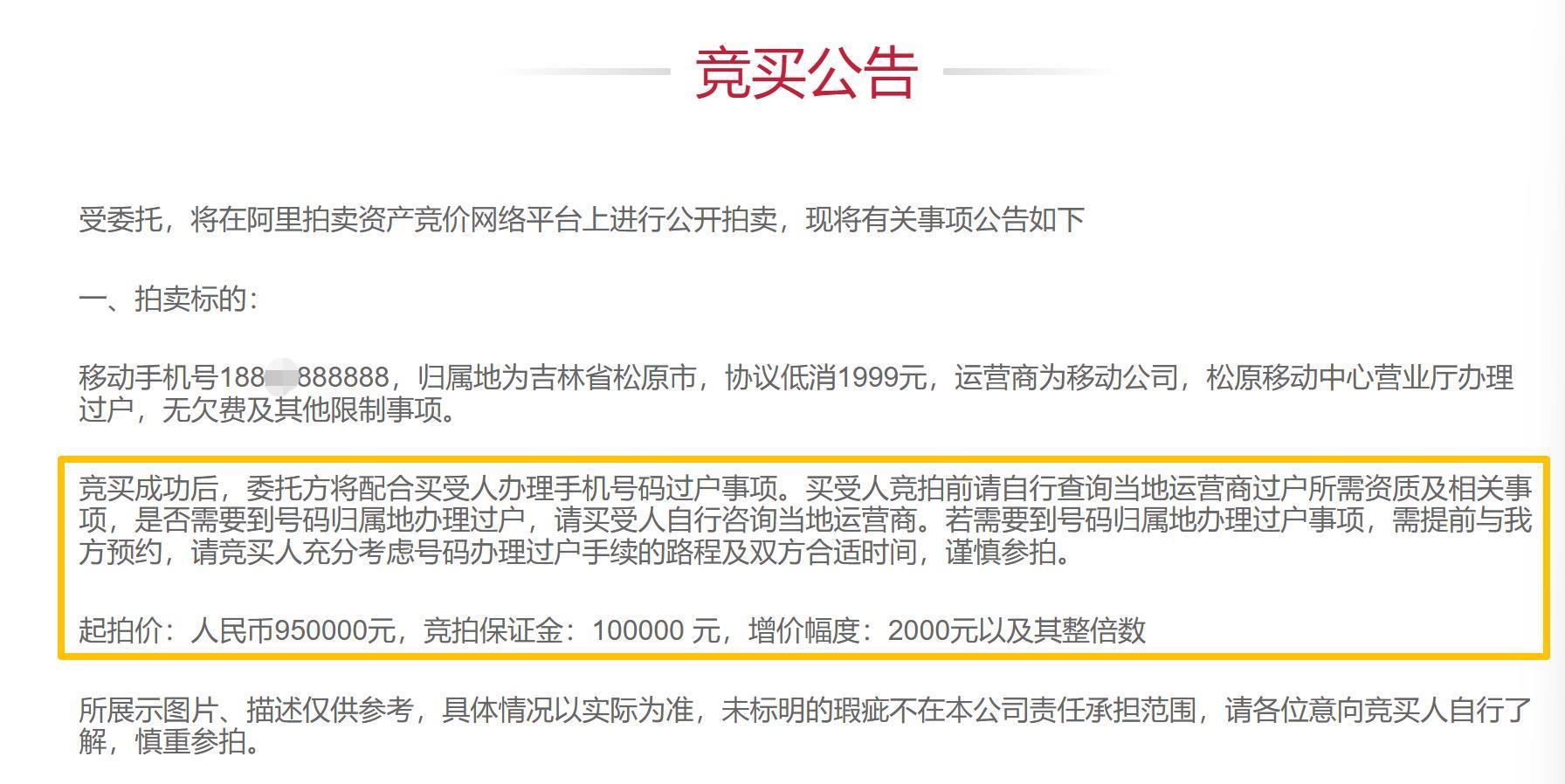 竞买公告中提到,该移动手机号188**888888起拍价95万元,竞拍保证金10万元,增加幅度为2000元(以及其整倍数)。买受人竞拍前请自行查询当地运营商过户所需资质及相关事项,是否需要到号码归属地办理过户,请买受人自行咨询当地运营商。竞买成功后,委托方将配合买受人办理手机号码过户事项。