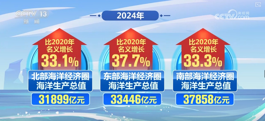 2024年,三大海洋经济圈海洋生产总值分别为31899亿元、33446亿元和37858亿元,分别比2020年名义增长33.1%、37.7%和33.3%。16个海洋经济发展示范区创新探索更加深入,推动海洋经济高质量发展。