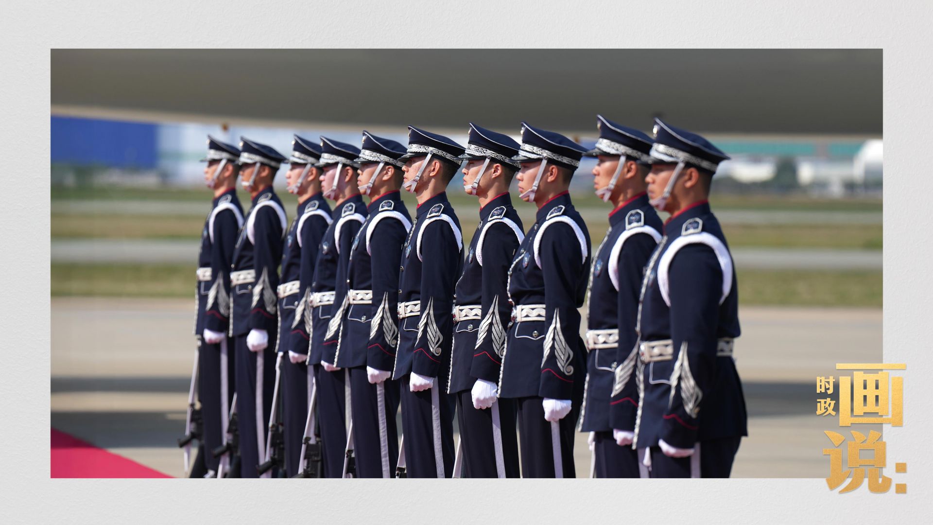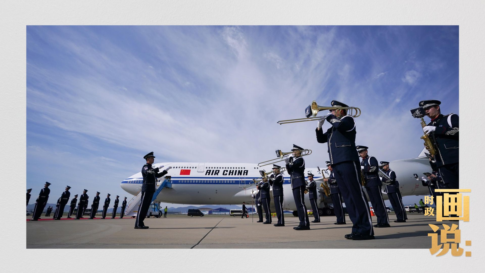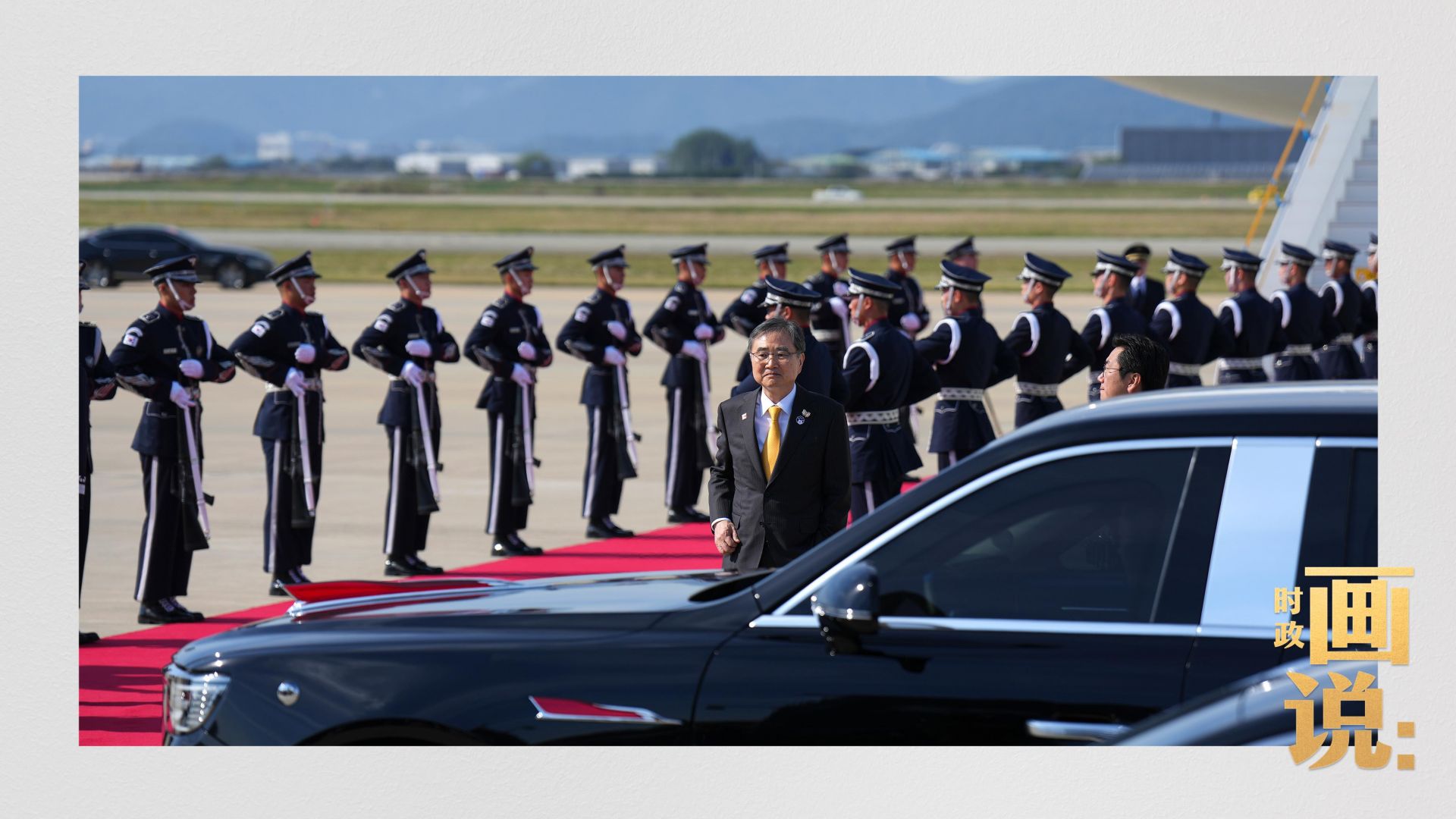 习近平抵达釜山金海国际机场时,韩国外长赵显等高级官员热情迎接。礼兵分列红地毯两侧致敬,军乐团演奏行进乐,机场鸣放21响礼炮。