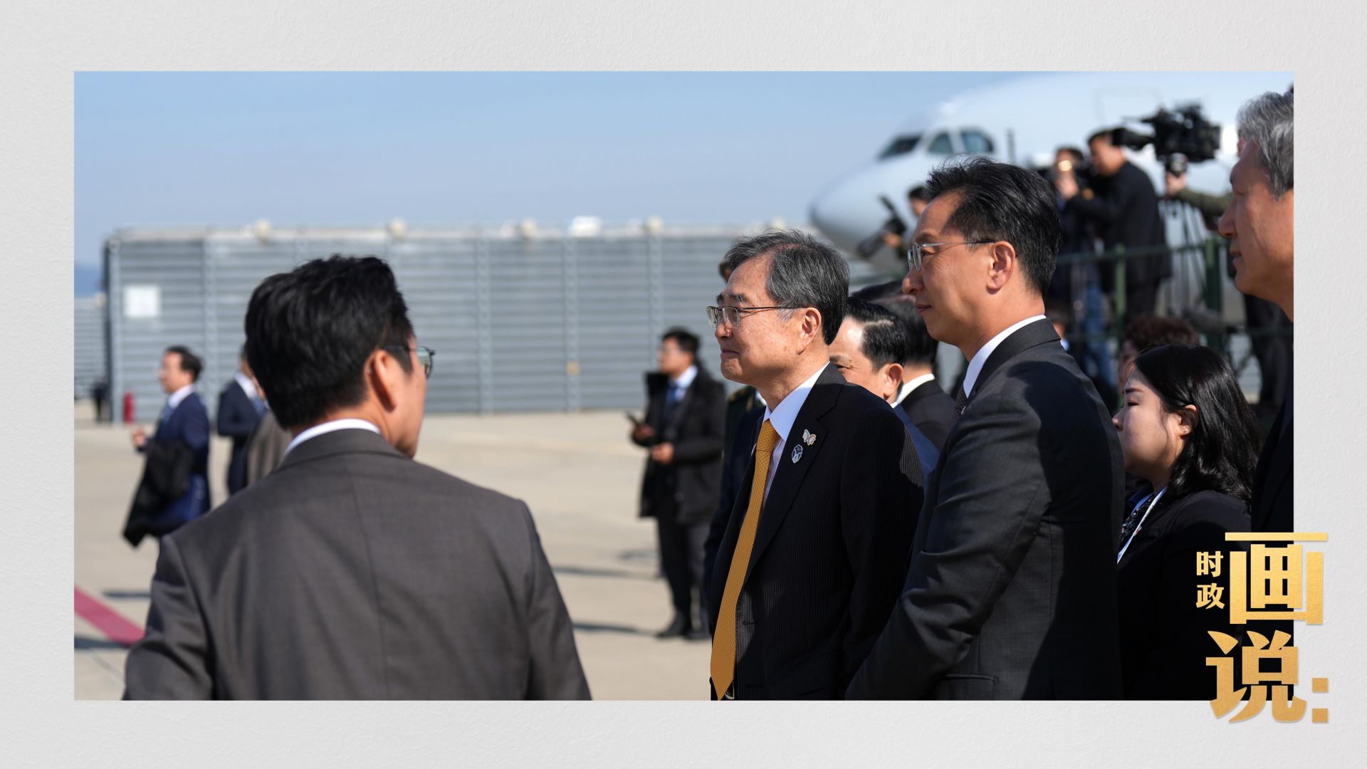 △韩国外交部长赵显在釜山金海国际机场热情迎接习近平主席