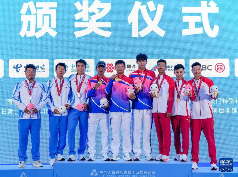 10月29日,男子49人级冠军上海队选手汪鑫(中)/戚天宇(右四)、亚军浙江队选手温在鼎(左二)/吕红鸣(左三)、季军山东队选手丁铭良(右二)/刘添(右一)与他们的教练在颁奖仪式上。