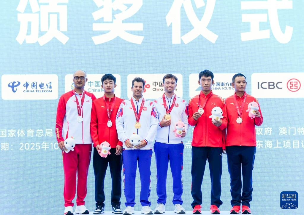 10月29日,冠军香港队选手贝俊龙(右三)、亚军山西队选手唐元帅(左二)和季军江苏队选手罗军锁(右二)在男子爱尔卡7级颁奖仪式上与教练合影。