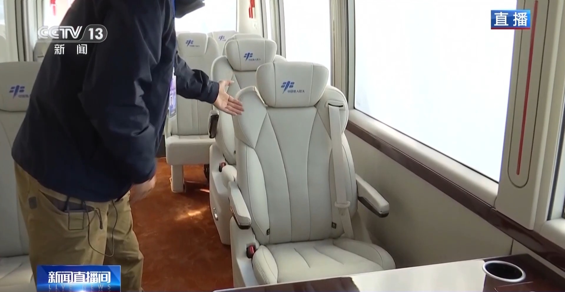 来到车内首先感受到的是内部空间更加宽敞,新车型的第一个特点就是缩减了座椅的数量,采用15座设计。其中有4个座位很特别,这是航天员的专用航空座椅。和普通座椅相比,专用座椅进行了加宽,它的宽度达到60厘米,可以进行6向电动调节。可以想象,当航天员穿着厚重的航天服坐在这里的时候,应该会比较舒适。